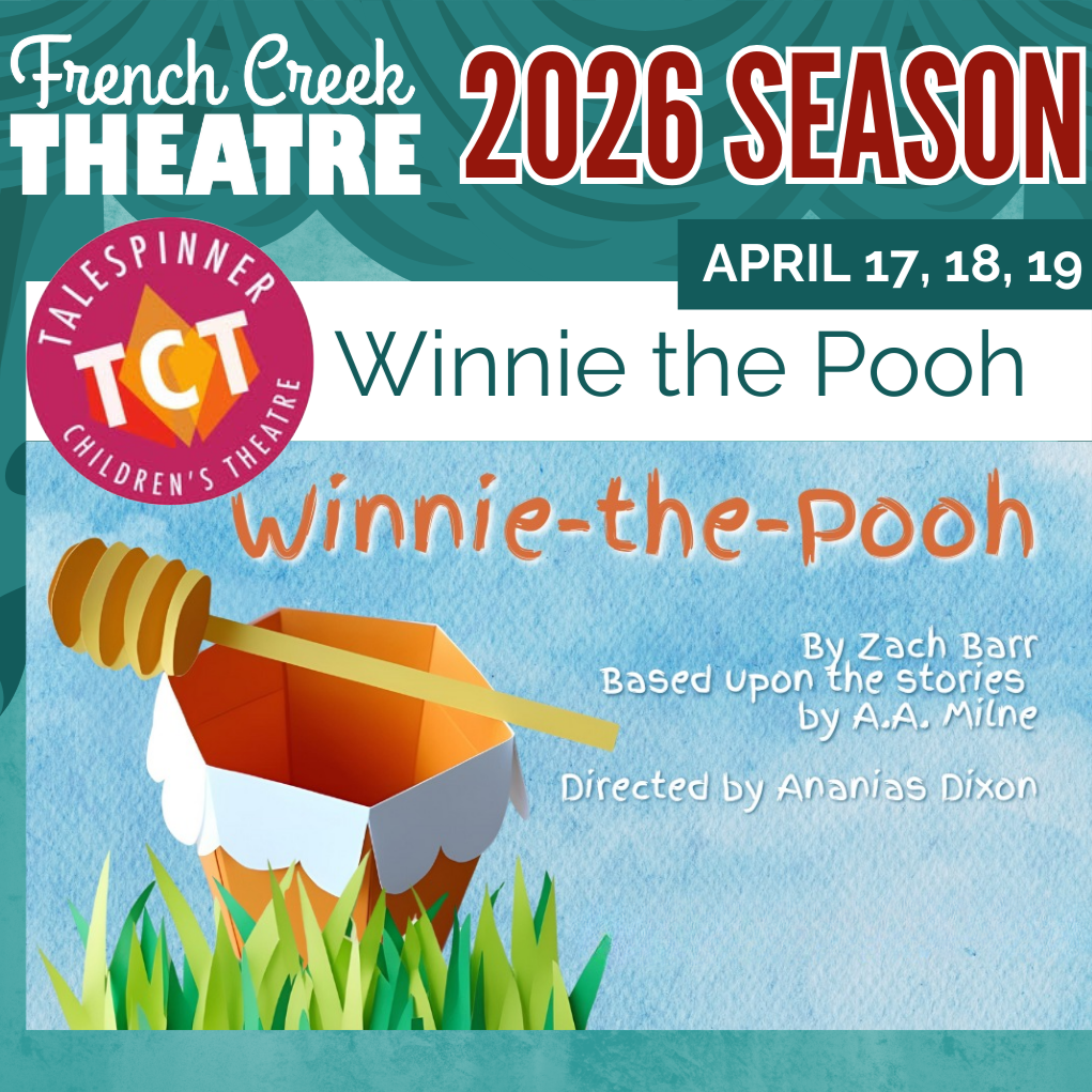 French Creek Theatre presents a Talespinner Children’s Theatre production of “Winnie the Pooh”. Join Christopher Robin and his friends—Rabbit, Eeyore, Piglet, and the “silly old bear” Winnie-the-Pooh—on an adventurous expedition to find the North Pole. When newcomers Kanga and little Roo arrive in the Hundred Acre Wood, Pooh and his companions set out on a Very Reasonable Plan to understand why they are there. Meanwhile, storm clouds are gathering, a flood may be on the way, and it might just be Eeyore’s birthday after all.