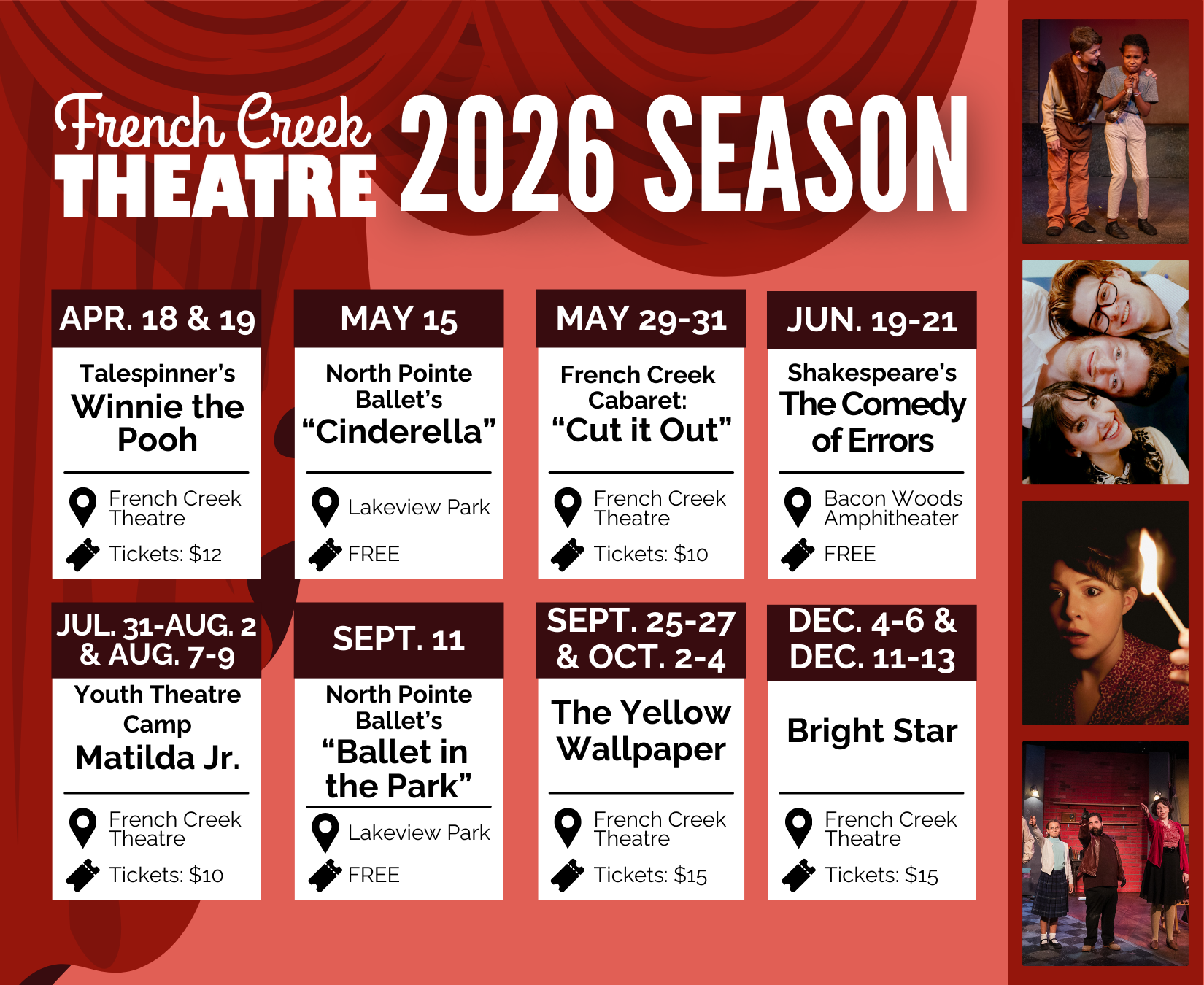 French Creek Theatre is Lorain County Metro Parks’ semi-professional, year-round theatre mounting new and classic works, as well as arts-based educational programming, to inspire, enliven and entertain. Located within the French Creek Nature Center in Sheffield Village, French Creek Theatre produces an eclectic and thoughtful season in the unique, 150-seat, wraparound Ewing Theatre. Priding itself on showcasing local talent for Northeast Ohio audiences, French Creek Theatre believes in uniting artist and audience through the mutual struggles, aims and hopes shared via the theatrical experience.